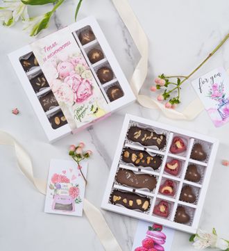 Конфеты ассорти без сахара, возможные вкусы: малина, клубника, матча, темный, молочный.