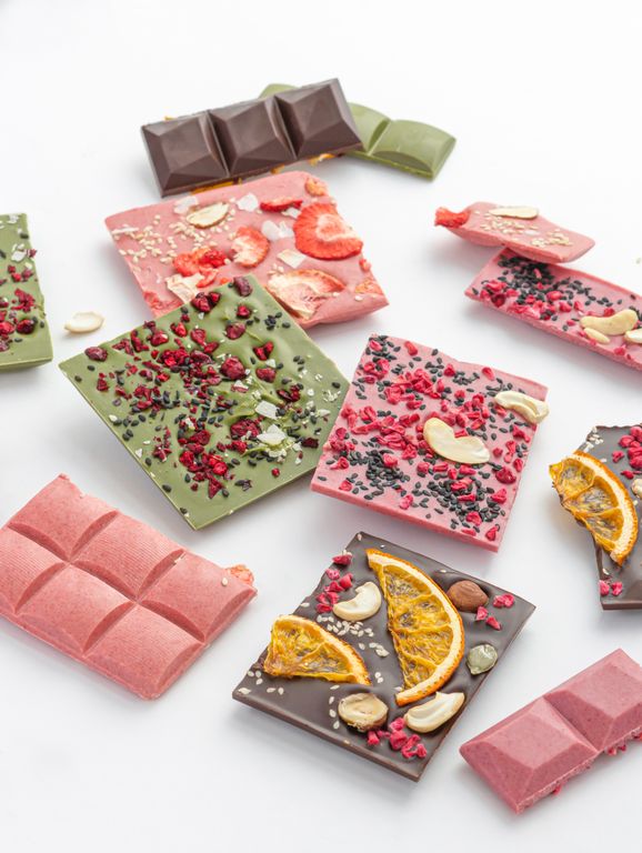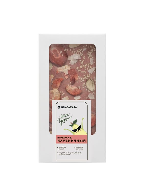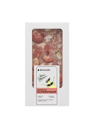 Состав: шоколад (водорастворимые волокна кукурузы, какао масло, молоко сухое, соевый лецитин, ваниль, подсластитель- сукралоза), порошок клубники, клубника сублимированная, кокос сушеный, Миндаль, семечки кунжута белого.