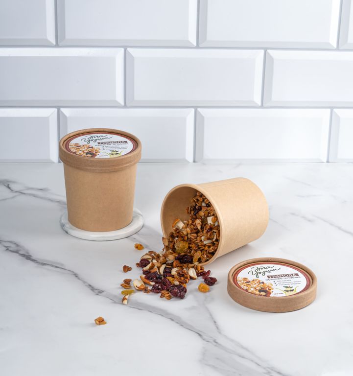 Состав : овсяные хлопья, миндаль, клюква вяленая, изюм, семена подсолнечника, розовая соль, корица, мёд, масло кокосовое.